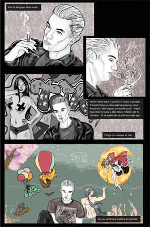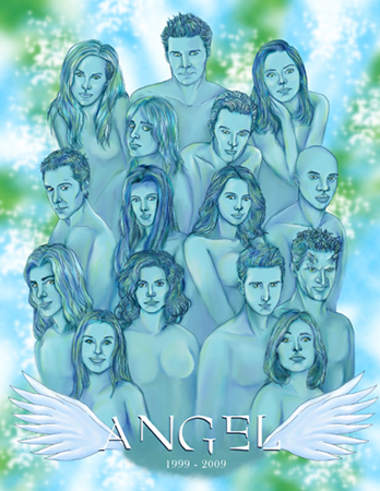 This illustration was done for the tenth anniversary of the television show Angel, featuring all the prominent stars of the show's five seasons.