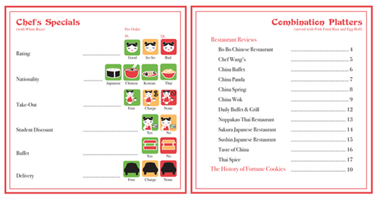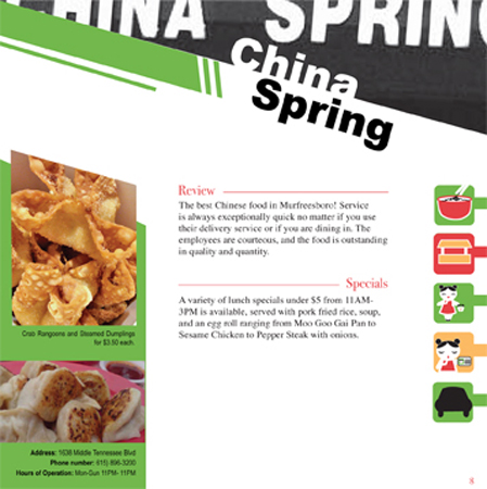 Wok! Don't Run! was a field guide listing all the restuarants serving exlusively Asian cuisine in Murfreesboro, TN. Each restuarant was reviewed, and it's score is located on a fortune which pulls out of the book.