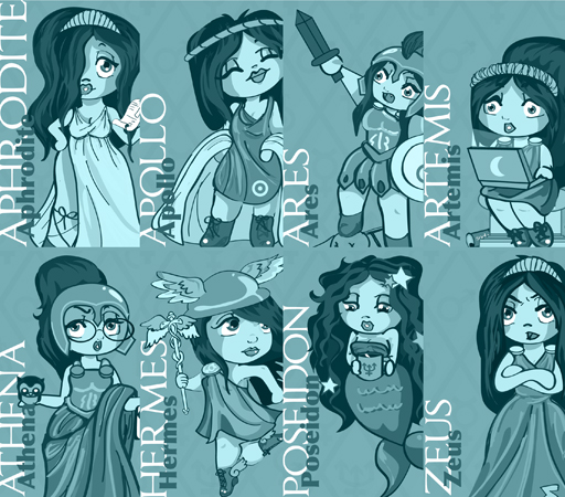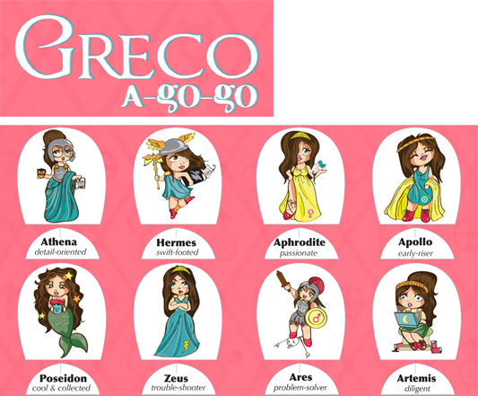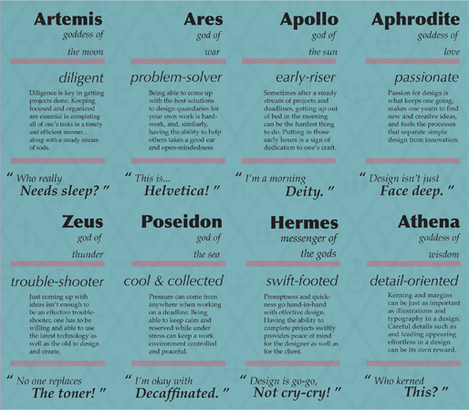 Greco-a-Go-Go was a self-promotion kit. It featured Greek Pantheon-inspired paperdolls and trading cards illustrating the qualities, I feel, make a good designer.